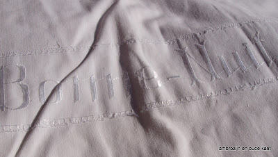 Nou je bent goed geslaag, het laken met het borduursel Bonne Nuit vind ik heel mooi.